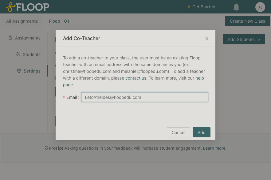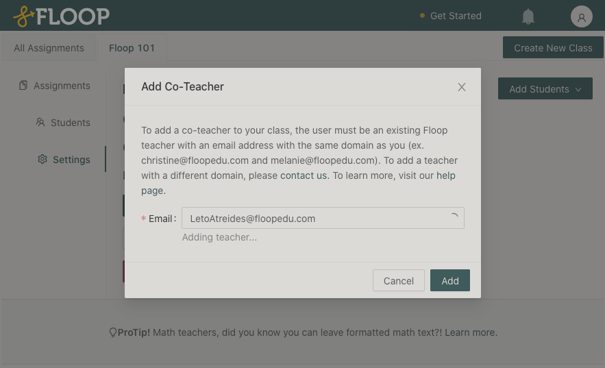 Click Add. Note: Please ensure this is the teacher you would like to add to your class. Removal of a co-teacher cannot be done automatically, and one must contact the Floop team separately.