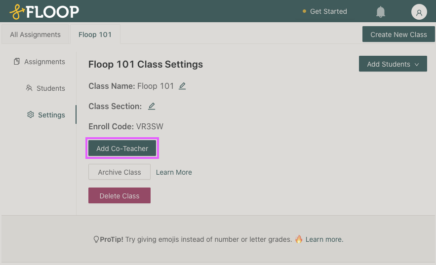The Co-Teacher feature enables teachers to automatically add a co-teacher to their Floop class.