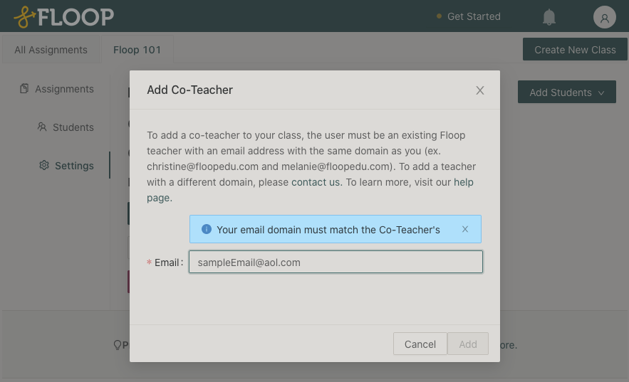 For the example below, the user (@floopedu.com) is trying to add a co-teacher (@aol.com) however the ‘Add’ button remains disabled due to their mismatching email address domains.