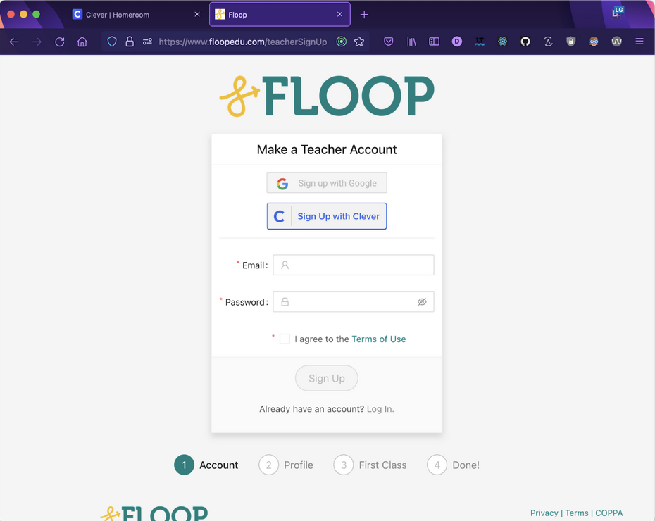 Once you sign up with Clever, you can log in with Clever. Students who were signed up for Floop by their teacher through a Clever Sync will be asked if they want to merge with an existing Floop account before logging in.